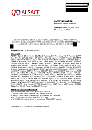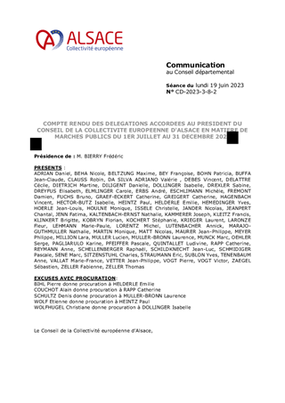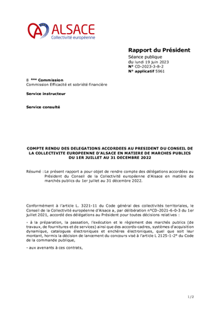 Le présent rapport a pour objet de rendre compte des délégations accordées au Président du Conseil de la Collectivité européenne d'Alsace en matière de marchés publics du 1er juillet au 31 décembre 2022.