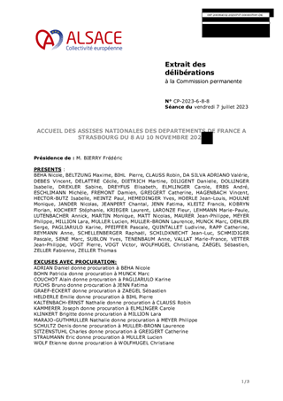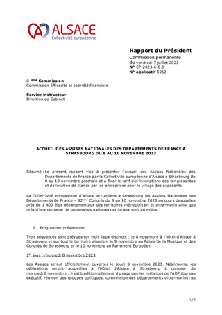 Le présent rapport vise à présenter l'accueil des Assises Nationales des Départements de France par la Collectivité européenne d'Alsace à Strasbourg du 8 au 10 novembre prochain et à fixer le tarif des inscriptions des congressistes et de location de stands par les entreprises pour le village des exposants.
