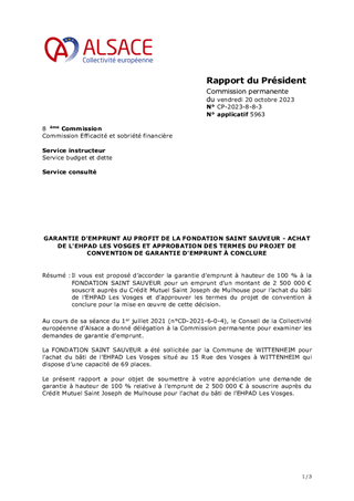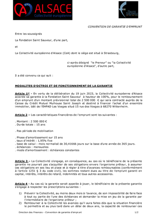 Il vous est proposé d’accorder la garantie d'emprunt à hauteur de 100 % à la FONDATION SAINT SAUVEUR pour un emprunt d’un montant de 2 500 000 € souscrit auprès du Crédit Mutuel Saint Joseph de Mulhouse pour l’achat du bâti de l’EHPAD Les Vosges et d’approuver les termes du projet de convention à conclure pour la mise en œuvre de cette décision.