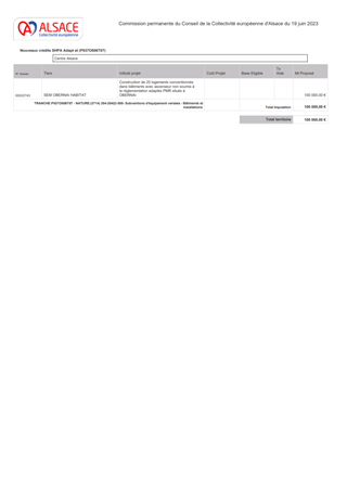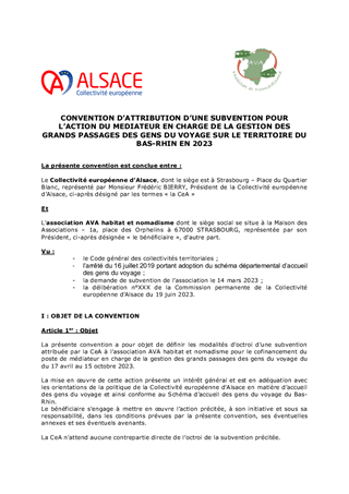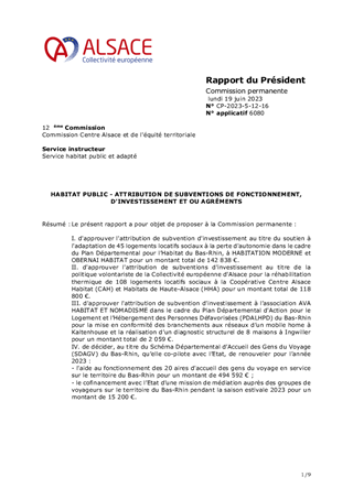 Le présent rapport a pour objet de proposer à la Commission permanente : I. d'approuver l'attribution de subvention d'investissement au titre du soutien à l'adaptation de 45 logements locatifs sociaux à la perte d'autonomie dans le cadre du Plan Départemental pour l’Habitat du Bas-Rhin, à HABITATION MODERNE et OBERNAI HABITAT pour un montant total de 142 838 €. II. d'approuver l'attribution de subventions d'investissement au titre de la politique volontariste de la Collectivité européenne d'Alsace pour la réhabilitation thermique de 108 logements locatifs sociaux à la Coopérative Centre Alsace Habitat (CAH) et Habitats de Haute-Alsace (HHA) pour un montant total de 118 800 €. III. d'approuver l'attribution de subvention d'investissement à l’association AVA HABITAT ET NOMADISME dans le cadre du Plan Départemental d'Action pour le Logement et l’Hébergement des Personnes Défavorisées (PDALHPD) du Bas-Rhin pour la mise en conformité des branchements aux réseaux d’un mobile home à Kaltenhouse et la réalisation d’un diagnostic structurel de 8 maisons à Ingwiller pour un montant total de 2 059 €. IV. de décider, au titre du Schéma Départemental d’Accueil des Gens du Voyage (SDAGV) du Bas-Rhin, qu’elle co-pilote avec l’Etat, de renouveler pour l’année 2023 : - l'aide au fonctionnement des 20 aires d'accueil des gens du voyage en service sur le territoire du Bas-Rhin pour un montant de 494 592 € ; - le cofinancement avec l’Etat d’une mission de médiation auprès des groupes de voyageurs sur le territoire du Bas-Rhin pendant la saison estivale 2023 pour un montant de 15 200 €.