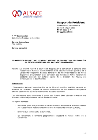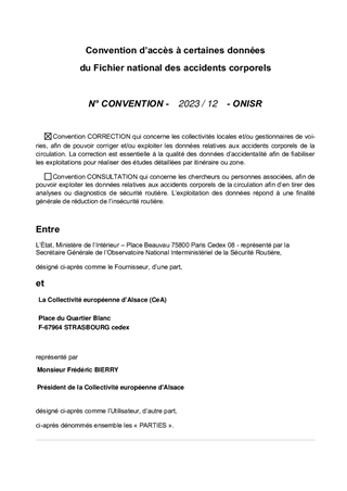 Le présent rapport a pour objet d’approuver la convention à conclure entre l’Observatoire National Interministériel de la Sécurité Routière (ONISR) et la Collectivité européenne d’Alsace, dans le but de définir les modalités de mise à disposition, d’exploitation et de correction des données du fichier national des accidents corporels par certains agents de la Direction des Routes, des Infrastructures et des Mobilités.