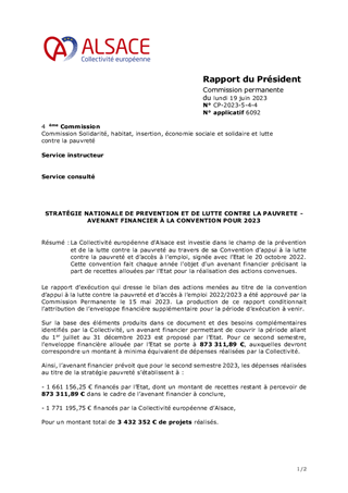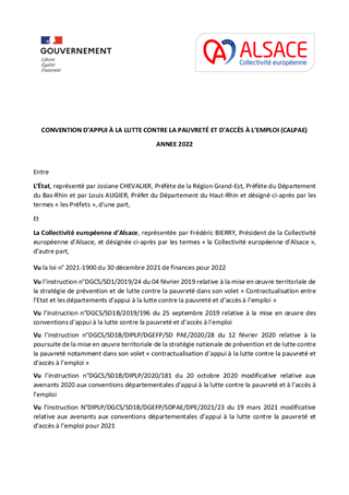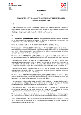 La Collectivité européenne d'Alsace est investie dans le champ de la prévention et de la lutte contre la pauvreté au travers de sa Convention d’appui à la lutte contre la pauvreté et d’accès à l’emploi, signée avec l’Etat le 20 octobre 2022. Cette convention fait chaque année l'objet d'un avenant financier précisant la part de recettes allouées par l'Etat pour la réalisation des actions convenues.