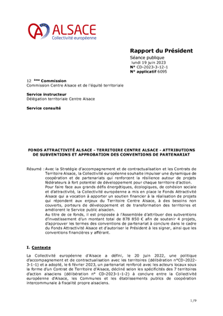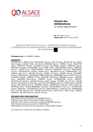 Avec la Stratégie d’accompagnement et de contractualisation et les Contrats de Territoire Alsace, la Collectivité européenne souhaite impulser une dynamique de coopération et de partenariats qui renforcent la résilience autour de projets fédérateurs à fort potentiel de développement pour chaque territoire d’action. Pour faire face aux grands défis énergétiques, écologiques, de cohésion sociale et d’attractivité, la Collectivité européenne a mis en place le Fonds Attractivité Alsace qui a vocation à apporter un soutien financier à la réalisation de projets qui répondent aux enjeux du Territoire Centre Alsace, à des besoins non couverts, porteurs de développement et de transformation des territoires et améliorent le Service public alsacien. Au titre de ce fonds, il est proposée à l’Assemblée d’attribuer des subventions d’investissement d’un montant total de 878 850 € afin de soutenir 4 projets, d’approuver les termes des conventions de partenariat à conclure dans le cadre du Fonds Attractivité Alsace et d’autoriser le Président à les signer, ainsi que les conventions financières y afférant.
