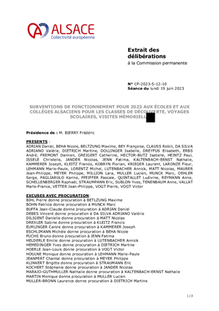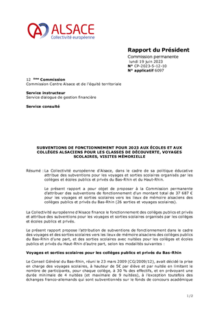 SUBVENTIONS DE FONCTIONNEMENT POUR 2023 AUX ÉCOLES ET AUX COLLÈGES ALSACIENS POUR LES CLASSES DE DÉCOUVERTE, VOYAGES SCOLAIRES, VISITES MÉMORIELLE