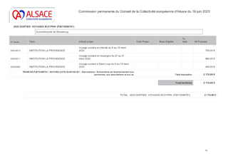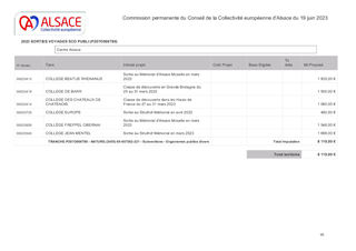 La Collectivité européenne d’Alsace, dans le cadre de sa politique éducative attribue des subventions pour les voyages et sorties scolaires organisés par les collèges et écoles publics et privés du Bas-Rhin et du Haut-Rhin. Le présent rapport a pour objet de proposer à la Commission permanente d’attribuer des subventions de fonctionnement d'un montant total de 37 687 € pour les voyages et sorties scolaires vers les lieux de mémoire alsaciens des collèges publics et privés du Bas-Rhin (26 sorties et voyages scolaires).