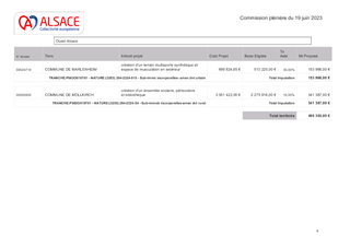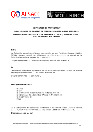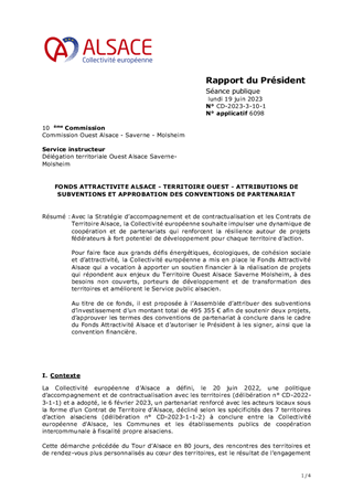 Avec la Stratégie d’accompagnement et de contractualisation et les Contrats de Territoire Alsace, la Collectivité européenne souhaite impulser une dynamique de coopération et de partenariats qui renforcent la résilience autour de projets fédérateurs à fort potentiel de développement pour chaque territoire d’action. Pour faire face aux grands défis énergétiques, écologiques, de cohésion sociale et d’attractivité, la Collectivité européenne a mis en place le Fonds Attractivité Alsace qui a vocation à apporter un soutien financier à la réalisation de projets qui répondent aux enjeux du Territoire Ouest Alsace Saverne Molsheim, à des besoins non couverts, porteurs de développement et de transformation des territoires et améliorent le Service public alsacien. Au titre de ce fonds, il est proposée à l’Assemblée d’attribuer des subventions d’investissement d’un montant total de 495 355 € afin de soutenir deux projets, d’approuver les termes des conventions de partenariat à conclure dans le cadre du Fonds Attractivité Alsace et d’autoriser le Président à les signer, ainsi que la convention financière.