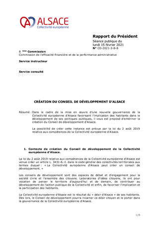 Dans le cadre de la mise en œuvre d’une nouvelle gouvernance de la Collectivité européenne d’Alsace favorisant l’implication des habitants dans le développement de ses politiques publiques, il vous est proposé d’entériner la création du Conseil de développement d'Alsace. La possibilité de créer cette instance est prévue par la loi du 2 août 2019 relative aux compétences de la Collectivité européenne d'Alsace.