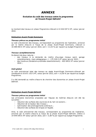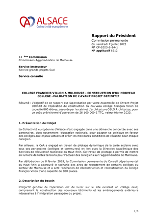 L’objectif de ce rapport est l’approbation par votre Assemblée de l’Avant-Projet Définitif de l’opération de construction du nouveau collège François Villon de capacité 800 élèves, assurée par le cabinet d’architecture OSLO Architectes, pour un coût prévisionnel d’opération de 26 100 000 € TTC, valeur février 2023.