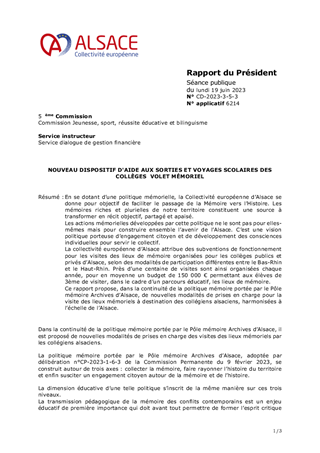 En se dotant d’une politique mémorielle, la Collectivité européenne d’Alsace se donne pour objectif de faciliter le passage de la Mémoire vers l’Histoire. Les mémoires riches et plurielles de notre territoire constituent une source à transformer en récit objectif, partagé et apaisé. Les actions mémorielles développées par cette politique ne le sont pas pour elles-mêmes mais pour construire ensemble l’avenir de l’Alsace. C’est une vision politique porteuse d’engagement citoyen et de développement des consciences individuelles pour servir le collectif. La collectivité européenne d’Alsace attribue des subventions de fonctionnement pour les visites des lieux de mémoire organisées pour les collèges publics et privés d’Alsace, selon des modalités de participation différentes entre le Bas-Rhin et le Haut-Rhin. Près d’une centaine de visites sont ainsi organisées chaque année, pour en moyenne un budget de 150 000 € permettant aux élèves de 3ème de visiter, dans le cadre d’un parcours éducatif, les lieux de mémoire. Ce rapport propose, dans la continuité de la politique mémoire portée par le Pôle mémoire Archives d’Alsace, de nouvelles modalités de prises en charge pour la visite des lieux mémoriels à destination des collégiens alsaciens, harmonisées à l’échelle de l’Alsace.