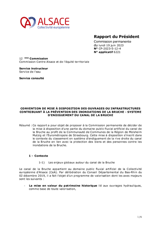 Ce rapport a pour objet de proposer à la Commission permanente de décider de la mise à disposition d’une partie du domaine public fluvial artificiel du canal de la Bruche au profit de la Communauté de Communes de la Région de Molsheim Mutzig et l’Eurométropole de Strasbourg. Cette mise à disposition s’inscrit dans le contexte du classement en système d’endiguement de la rive droite du canal de la Bruche en lien avec la protection des biens et des personnes contre les inondations de la Bruche.