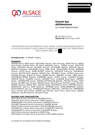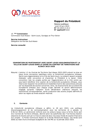 L’article 1.2 du Contrat de Territoire Sud Alsace 2022-2025 prévoit la mise en place d’une convention spécifique entre la Collectivité européenne d’Alsace, Saint-Louis Agglomération et la Ville de Saint-Louis. Le présent rapport propose d’adopter cette convention et d’autoriser le Président à la signer. Cette convention liste les projets portés par l’Agglomération et la Ville centre qui pourraient bénéficier d'un soutien de la Collectivité européenne d'Alsace, sous réserve de respecter les conditions et modalités d'octroi des subventions prévues par les dispositifs de soutien concernés. Ainsi, les financements de la Collectivité européenne d'Alsace pour chaque projet identifié ne seront définitivement engagés qu'après l'adoption d'une délibération ultérieure allouant les subventions correspondantes, après production des avants projets définitifs et selon les règles du fonds alsacien mobilisé.