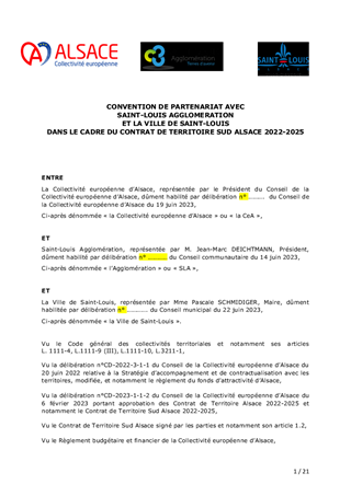 CONVENTION DE PARTENARIAT AVEC SAINT-LOUIS AGGLOMERATION ET LA VILLE DE SAINT-LOUIS DANS LE CADRE DU CONTRAT DE TERRITOIRE SUD ALSACE 2022-2025