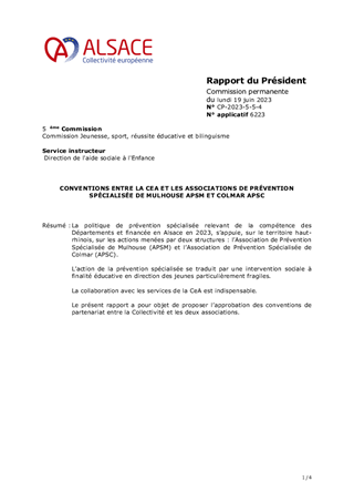 La politique de prévention spécialisée relevant de la compétence des Départements et financée en Alsace en 2023, s’appuie, sur le territoire haut-rhinois, sur les actions menées par deux structures : l’Association de Prévention Spécialisée de Mulhouse (APSM) et l’Association de Prévention Spécialisée de Colmar (APSC). L’action de la prévention spécialisée se traduit par une intervention sociale à finalité éducative en direction des jeunes particulièrement fragiles. La collaboration avec les services de la CeA est indispensable. Le présent rapport a pour objet de proposer l’approbation des conventions de partenariat entre la Collectivité et les deux associations.