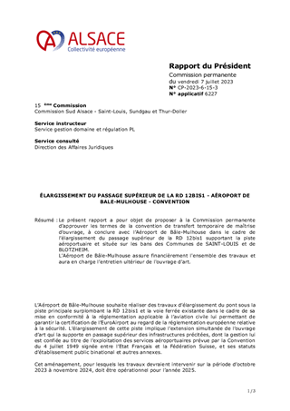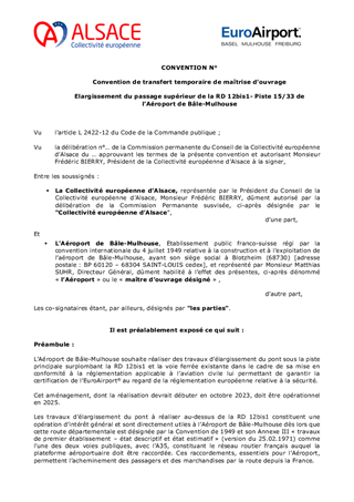 Le présent rapport a pour objet de proposer à la Commission permanente d’approuver les termes de la convention de transfert temporaire de maîtrise d’ouvrage, à conclure avec l’Aéroport de Bâle-Mulhouse dans le cadre de l’élargissement du passage supérieur de la RD 12bis1 supportant la piste aéroportuaire et située sur les bans des Communes de SAINT-LOUIS et de BLOTZHEIM. L’Aéroport de Bâle-Mulhouse assure financièrement l'ensemble des travaux et aura en charge l’entretien ultérieur de l'ouvrage d'art.