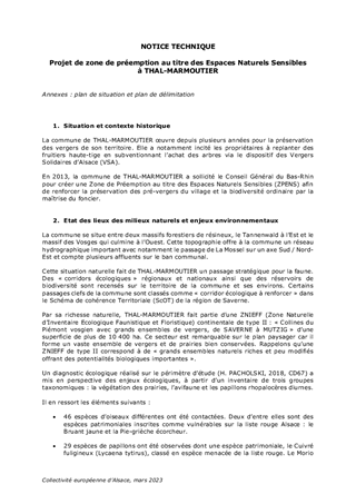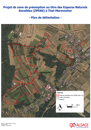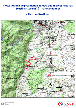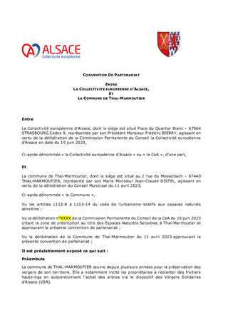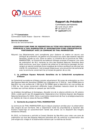 Les Départements sont compétents pour élaborer et mettre en œuvre une politique de protection, de gestion et d’ouverture au public des espaces naturels sensibles, boisés ou non. Dans ce cadre, à l’initiative de la Commune de THAL-MARMOUTIER, la Collectivité européenne d’Alsace propose d’instaurer une zone de préemption de 49,1 hectares au titre des Espaces Naturels Sensibles dans cette commune, avec pour vocation de préserver le patrimoine paysager de pré-vergers et naturel constitué d’une mosaïque de milieux conférant au site tout son intérêt. En complément, il est proposé d’approuver une convention de partenariat avec la commune concernant les principes de gestion de ce site.
