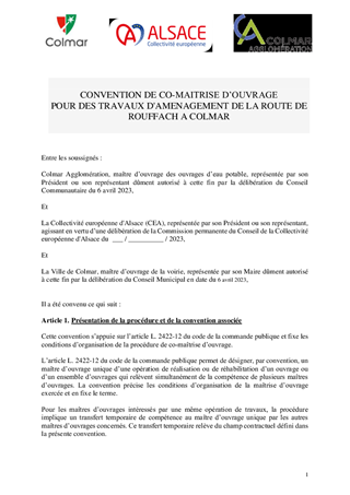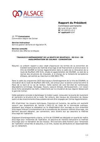 Le présent rapport a pour objet d’approuver les termes de la convention de transfert temporaire de maîtrise d’ouvrage et de financement à conclure avec la Ville de COLMAR et Colmar Agglomération dans le cadre de la rénovation de la route de Rouffach (RD 514), située en agglomération de COLMAR. Le coût de la reprise des structures de chaussée, à la charge de la Collectivité européenne d’Alsace, est estimé au maximum à 200 000 € TTC.