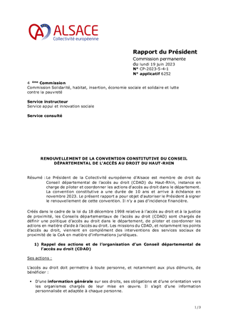 Le Président de la Collectivité européenne d'Alsace est membre de droit du Conseil départemental de l'accès au droit (CDAD) du Haut-Rhin, instance en charge de piloter et coordonner les actions d'accès au droit dans le département. La convention constitutive a une durée de 10 ans et arrive à échéance en novembre 2023. Le présent rapport a pour objet d'autoriser le Président à signer le renouvellement de cette convention. Il n'y a pas d'incidence financière.