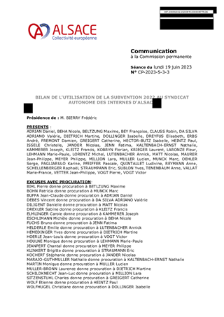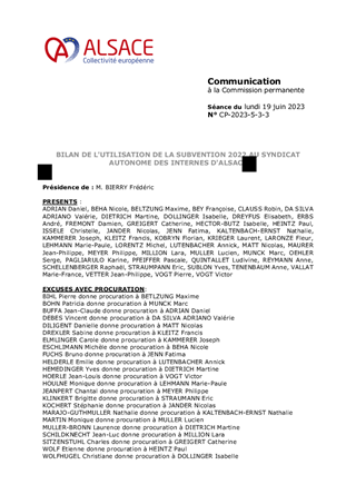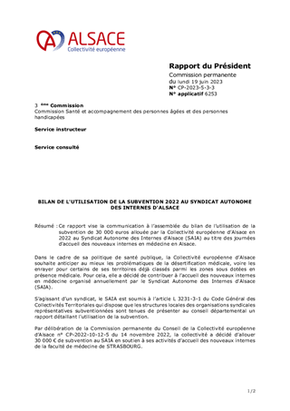 Ce rapport vise la communication à l’assemblée du bilan de l’utilisation de la subvention de 30 000 euros allouée par la Collectivité européenne d’Alsace en 2022 au Syndicat Autonome des Internes d'Alsace (SAIA) au titre des journées d'accueil des nouveaux internes en médecine en Alsace.