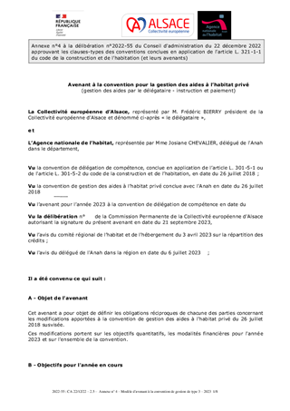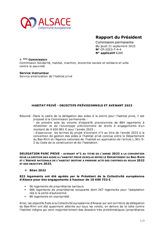 Dans le cadre de la délégation des aides à la pierre pour l'habitat privé, il est proposé à la Commission permanente : - de prendre acte du volume d’objectifs previsionnels de 884 logements à réhabiliter et de l’enveloppe prévisionnelle de droits à engagements d’un montant de 9 630 801 € pour l'année 2023 ; - d'approuver les termes du projet d’avenant n°1 au titre de l’année 2023 à la convention de gestion des aides à l’habitat privé conclue entre le Département du Bas-Rhin et l’Agence nationale de l’habitat en application de l’article L.301-5-2 du Code de la construction et de l’habitation.