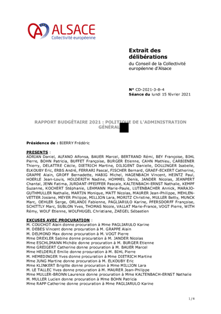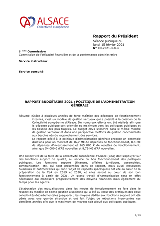 Grâce à plusieurs années de forte maîtrise des dépenses de fonctionnement internes, c’est un modèle de gestion vertueux qui a présidé à la création de la Collectivité européenne d’Alsace. De nombreux efforts ont été réalisés afin que la dépense publique soit orientée au maximum vers les politiques publiques et les besoins des plus fragiles. Le budget 2021 s’inscrira dans le même modèle de gestion vertueux et dans une perspective d’efforts de gestion concomitants aux besoins nés du rapprochement des services. Le rapport dédié à la politique d’administration générale propose un ensemble d'actions pour un montant de 16,7 M€ de dépenses de fonctionnement, 8,8 M€ de dépenses d’investissement et 165 000 € de recettes de fonctionnement, ainsi que 54 000 € d’AE nouvelles et 8,79 M€ d’AP nouvelles.