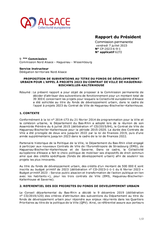 Le présent rapport a pour objet de proposer à la Commission permanente de décider d’attribuer des subventions de fonctionnement pour un montant total de 39 300 € concernant les projets pour lesquels la Collectivité européenne d'Alsace a été sollicitée au titre du fonds de développement urbain, dans le cadre de l'appel à projets 2023 du Contrat de Ville de Haguenau-Bischwiller-Kaltenhouse.