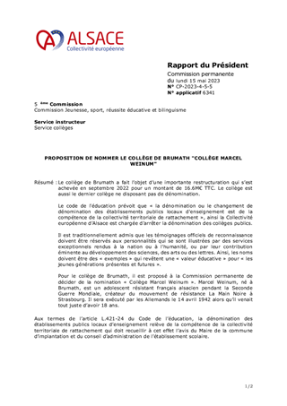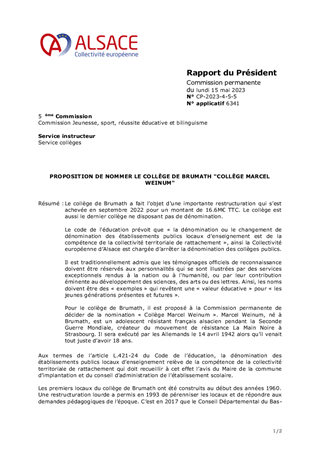 Le collège de Brumath a fait l’objet d’une importante restructuration qui s’est achevée en septembre 2022 pour un montant de 16.6M€ TTC. Le collège est aussi le dernier collège ne disposant pas de dénomination. Le code de l'éducation prévoit que « la dénomination ou le changement de dénomination des établissements publics locaux d'enseignement est de la compétence de la collectivité territoriale de rattachement », ainsi la Collectivité européenne d’Alsace est chargée d’arrêter la dénomination des collèges publics. Il est traditionnellement admis que les témoignages officiels de reconnaissance doivent être réservés aux personnalités qui se sont illustrées par des services exceptionnels rendus à la nation ou à l'humanité, ou par leur contribution éminente au développement des sciences, des arts ou des lettres. Ainsi, les noms doivent être des « exemples » qui revêtent une « valeur éducative » pour « les jeunes générations présentes et futures ». Pour le collège de Brumath, il est proposé à la Commission permanente de décider de la nomination « Collège Marcel Weinum ». Marcel Weinum, né à Brumath, est un adolescent résistant français alsacien pendant la Seconde Guerre Mondiale, créateur du mouvement de résistance La Main Noire à Strasbourg. Il sera exécuté par les Allemands le 14 avril 1942 alors qu’il venait tout juste d’avoir 18 ans.