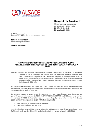 GARANTIE D'EMPRUNT POLE HABITAT COLMAR CENTRE ALSACE RÉHABILITATION THERMIQUE DE 36 LOGEMENTS LOCATIFS SOCIAUX A COLMAR