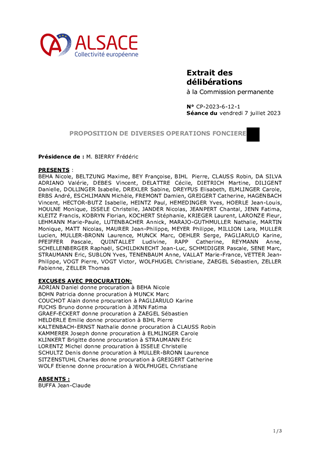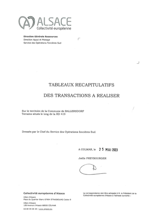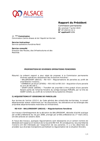 Le présent rapport a pour objet de proposer à la Commission permanente diverses opérations nécessitant des évolutions foncières : - BALLERSDORF (68210) - RD 419 – Régularisations de parcelles au profit de propriétaires riverains ; - DAMBACH-LA-VILLE (67650) – RD 1422 et RD 210 - Acquisition d’une parcelle au prix de 567,00 € ; - SAINT-LOUIS (68300) – Transfert de propriété à titre gratuit d’une parcelle faisant partie de l’emprise foncière du collège Georges FORLEN, par la Ville de SAINT-LOUIS, au profit de la Collectivité européenne d’Alsace.