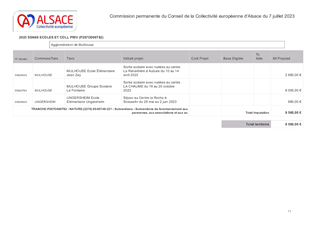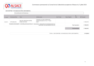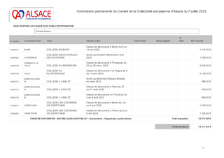 La Collectivité européenne d’Alsace, dans le cadre de sa politique éducative attribue des subventions pour les voyages et sorties scolaires organisés par les collèges et écoles publics et privés du Bas-Rhin et du Haut-Rhin. Le présent rapport a pour objet de proposer à la Commission permanente d’attribuer des subventions de fonctionnement pour un montant total de 49 860 € pour les voyages et sorties scolaires vers les lieux de mémoire alsaciens des collèges publics et privés du Bas-Rhin (1916 élèves - 32 sorties et voyages scolaires) et les sorties scolaires avec nuitées pour les écoles publiques et privées du Haut-Rhin (304 élèves – 7 sorties scolaires avec nuitées).