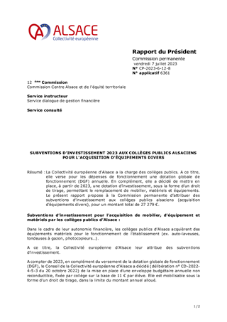 SUBVENTIONS D'INVESTISSEMENT 2023 AUX COLLÈGES PUBLICS ALSACIENS POUR L'ACQUISITION D'ÉQUIPEMENTS DIVERS
