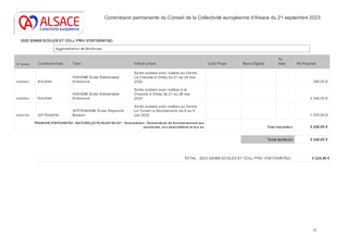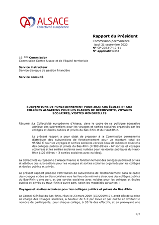La Collectivité européenne d’Alsace, dans le cadre de sa politique éducative attribue des subventions pour les voyages et sorties scolaires organisés par les collèges et écoles publics et privés du Bas-Rhin et du Haut-Rhin. Le présent rapport a pour objet de proposer à la Commission permanente d’attribuer des subventions de fonctionnement pour un montant total de 95 560 € pour les voyages et sorties scolaires vers les lieux de mémoire alsaciens des collèges publics et privés du Bas-Rhin (4 589 élèves - 67 sorties et voyages scolaires) et les sorties scolaires avec nuitées pour les écoles publiques du Haut-Rhin (129 élèves – 3 sorties scolaires avec nuitées).