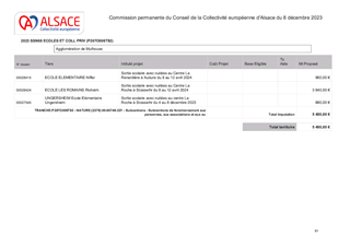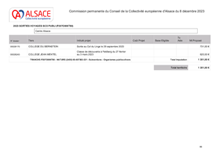 La Collectivité européenne d’Alsace, dans le cadre de sa politique éducative attribue des subventions pour les voyages et sorties scolaires organisés par les collèges et écoles publics et privés du Bas-Rhin et du Haut-Rhin. Le présent rapport a pour objet de proposer à la Commission permanente d’attribuer des subventions de fonctionnement pour un montant total de 37 260 € pour les voyages et sorties scolaires vers les lieux de mémoire alsaciens des collèges publics et privés du Bas-Rhin (1018 élèves - 15 sorties et voyages scolaires) et les sorties scolaires avec nuitées pour les écoles publiques et privées du Haut-Rhin (487 élèves – 14 sorties scolaires avec nuitées).