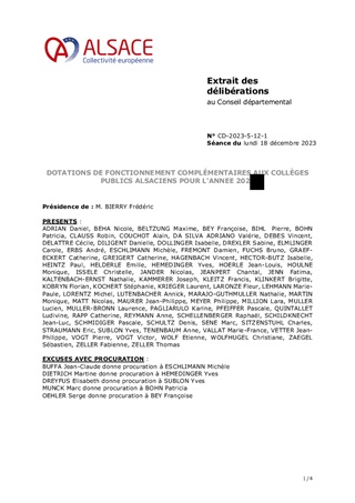 DOTATIONS DE FONCTIONNEMENT COMPLÉMENTAIRES AUX COLLÈGES PUBLICS ALSACIENS POUR L'ANNEE 2023