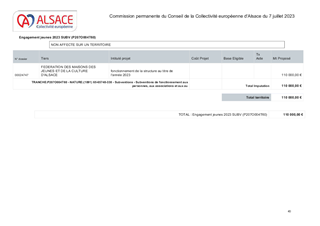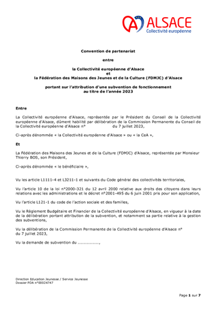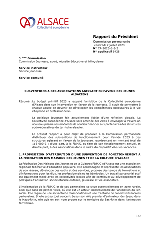 Le budget primitif 2023 a rappelé l’ambition de la Collectivité européenne d’Alsace dans son intervention en faveur de la jeunesse. Il s'agit de permettre à chaque adulte en devenir de développer les compétences nécessaires à la vie citoyenne et professionnelle. La politique jeunesse fait actuellement l’objet d’une réflexion globale. La Collectivité européenne d’Alsace sera amenée dès 2024 à envisager à travers un nouveau prisme ses modalités de soutien financier aux partenaires des structures socio-éducatives du territoire alsacien. Le présent rapport a pour objet de proposer à la Commission permanente d'attribuer des subventions de fonctionnement pour l’année 2023 à des structures agissant en faveur de la jeunesse, représentant un montant total de 116 900 € : d'une part, à la FDMJC au titre de son fonctionnement annuel, et d'autre part, à des associations dans le cadre du dispositif ville-vie-vacances.