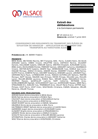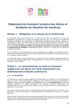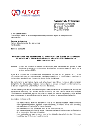 Il vous est proposé d’adopter le règlement des transports des élèves et des étudiants en situation de handicap appliqué au territoire Alsace à partir de la rentrée scolaire 2023.