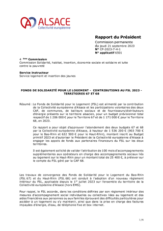Le Fonds de Solidarité pour le Logement (FSL) est alimenté par la contribution de la Collectivité européenne d'Alsace et les participations volontaires des deux CAF, de communes, de bailleurs sociaux et de fournisseurs/distributeurs d’énergie présents sur le territoire alsacien, pour un budget prévisionnel total respectif de 1 206 000 € pour le Territoire 67 et de 1 171 000 € pour le Territoire 68, en 2023. Ce rapport a pour objet d'approuver l'abondement des deux budgets 67 et 68 par la Collectivité européenne d'Alsace, à hauteur de 1 536 200 € (903 700 € pour le Bas-Rhin et 632 500 € pour le Haut-Rhin), montant inscrit au Budget primitif 2023 et d'autoriser le Président de la Collectivité européenne d'Alsace à engager les appels de fonds aux partenaires financeurs du FSL sur les deux territoires. Il est également sollicité de valider l'attribution de 100 mois d'accompagnements supplémentaires aux opérateurs en charge des accompagnements sociaux liés au logement sur le Haut-Rhin pour un montant total de 25 400 €, à prélever sur le compte du FSL géré par la CAF 68.