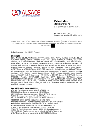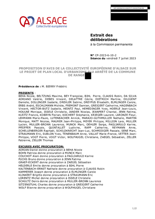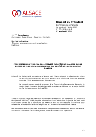 PROPOSITION D'AVIS DE LA COLLECTIVITÉ EUROPÉENNE D'ALSACE SUR LE PROJET DE PLAN LOCAL D'URBANISME PLU ARRÊTÉ DE LA COMMUNE DE RANGEN