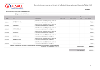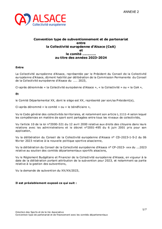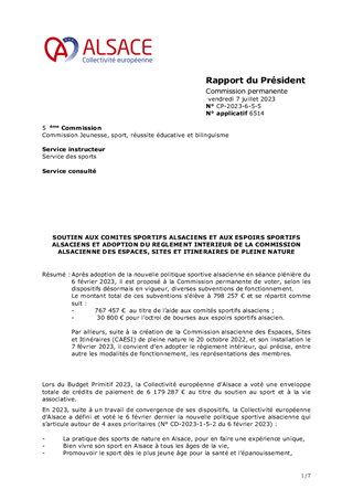 Après adoption de la nouvelle politique sportive alsacienne en séance plénière du 6 février 2023, il est proposé à la Commission permanente de voter, selon les dispositifs désormais en vigueur, diverses subventions de fonctionnement. Le montant total de ces subventions s’élève à 798 257 € et se répartit comme suit : - 767 457 € au titre de l’aide aux comités sportifs alsaciens ; - 30 800 € pour l’octroi de bourses aux espoirs sportifs alsacien. Par ailleurs, suite à la création de la Commission alsacienne des Espaces, Sites et Itinéraires (CAESI) de pleine nature le 20 octobre 2022, et son installation le 7 février 2023, il convient d’en adopter le règlement intérieur, qui précise, entre autre les modalités de fonctionnement, les représentations des membres.