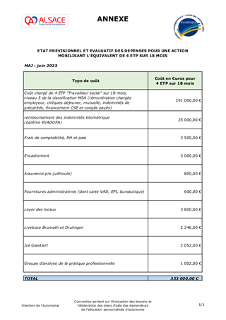 A compter de juillet 2023, il est proposé de nouer un partenariat de 18 mois avec le groupement EVADOPA (Évaluation Accompagnement à Domicile des Personnes Âgées) fondés par les régimes de retraite pour réaliser des évaluations à domicile de demandeurs de l’allocation personnalisée d’autonomie dans l’objectif de résorber un retard de traitement lié à des absences et des vacances de poste en 2022 et une augmentation du nombre de demandes. Cet appui facilitera également la mise en œuvre sur le territoire Nord Alsace d’une expérimentation de territorialisation des équipes autonomie. Le coût total de l'opération s'élève à 330 000 € dont 99 000 € au titre de l’année 2023.