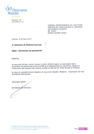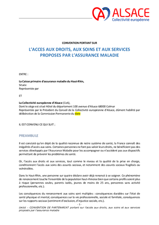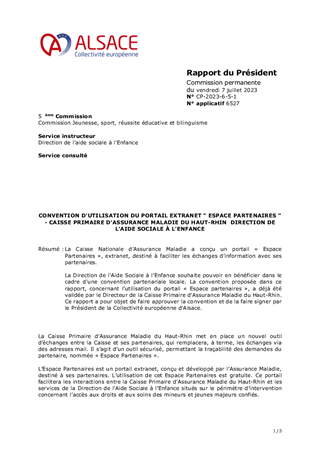 La Caisse Nationale d’Assurance Maladie a conçu un portail « Espace Partenaires », extranet, destiné à faciliter les échanges d'information avec ses partenaires. La Direction de l'Aide Sociale à l'Enfance souhaite pouvoir en bénéficier dans le cadre d'une convention partenariale locale. La convention proposée dans ce rapport, concernant l’utilisation du portail « Espace partenaires », a déjà été validée par le Directeur de la Caisse Primaire d’Assurance Maladie du Haut-Rhin. Ce rapport a pour objet de faire approuver la convention et de la faire signer par le Président de la Collectivité européenne d'Alsace.