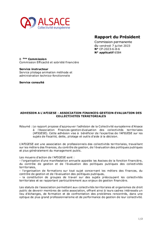 Le rapport propose d'approuver l'adhésion de la Collectivité européenne d'Alsace à l'Association Finances-gestion-évaluation des collectivités territoriales (AFIGESE). Cette adhésion vise à bénéficier de l'expertise de l'AFIGESE sur les sujets de fiscalité, dette, pilotage et outils d'aide à la décision.
