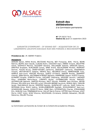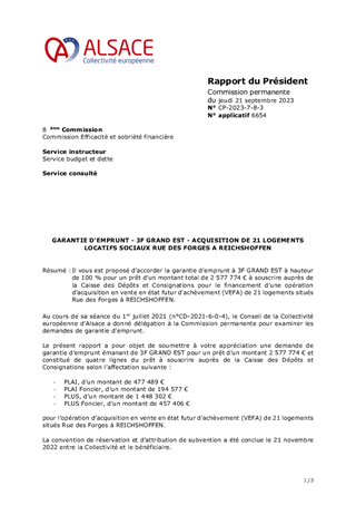 Il vous est proposé d’accorder la garantie d'emprunt à 3F GRAND EST à hauteur de 100 % pour un prêt d’un montant total de 2 577 774 € à souscrire auprès de la Caisse des Dépôts et Consignations pour le financement d'une opération d’acquisition en vente en état futur d'achèvement (VEFA) de 21 logements situés Rue des Forges à REICHSHOFFEN.