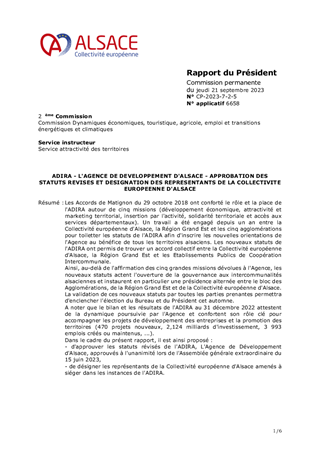 Les Accords de Matignon du 29 octobre 2018 ont conforté le rôle et la place de l'ADIRA autour de cinq missions (développement économique, attractivité et marketing territorial, insertion par l'activité, solidarité territoriale et accès aux services départementaux). Un travail a été engagé depuis un an entre la Collectivité européenne d'Alsace, la Région Grand Est et les cinq agglomérations pour toiletter les statuts de l'ADIRA afin d'inscrire les nouvelles orientations de l'Agence au bénéfice de tous les territoires alsaciens. Les nouveaux statuts de l'ADIRA ont permis de trouver un accord collectif entre la Collectivité européenne d'Alsace, la Région Grand Est et les Etablissements Publics de Coopération Intercommunale. Ainsi, au-delà de l'affirmation des cinq grandes missions dévolues à l'Agence, les nouveaux statuts actent l'ouverture de la gouvernance aux intercommunalités alsaciennes et instaurent en particulier une présidence alternée entre le bloc des Agglomérations, de la Région Grand Est et de la Collectivité européenne d'Alsace. La validation de ces nouveaux statuts par toutes les parties prenantes permettra d'enclencher l'élection du Bureau et du Président cet automne. A noter que le bilan et les résultats de l'ADIRA au 31 décembre 2022 attestent de la dynamique poursuivie par l'Agence et confortent son rôle clé pour accompagner les projets de développement des entreprises et la promotion des territoires (470 projets nouveaux, 2,124 milliards d'investissement, 3 993 emplois créés ou maintenus, ...). Dans le cadre du présent rapport, il est ainsi proposé : - d'approuver les statuts révisés de l'ADIRA, L'Agence de Développement d'Alsace, approuvés à l'unanimité lors de l'Assemblée générale extraordinaire du 15 juin 2023, - de désigner les représentants de la Collectivité européenne d'Alsace amenés à siéger dans les instances de l'ADIRA.