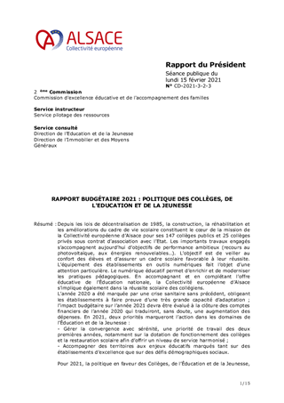 RAPPORT BUDGÉTAIRE 2021 : POLITIQUE DES COLLÈGES, DE L'EDUCATION ET DE LA JEUNESSE