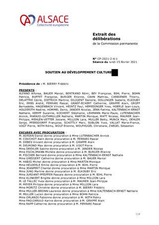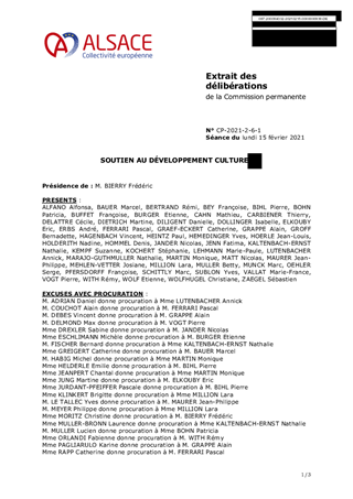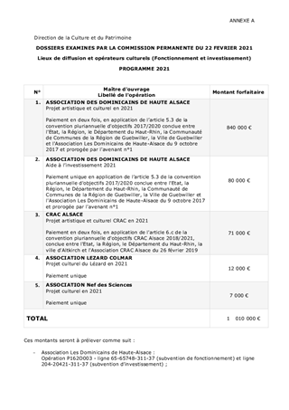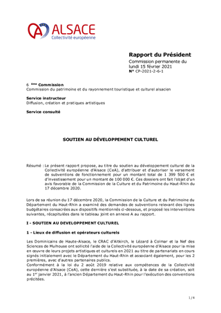 Le présent rapport propose, au titre du soutien au développement culturel de la Collectivité européenne d’Alsace (CeA), d'attribuer et d'autoriser le versement de subventions de fonctionnement pour un montant total de 1 399 500 € et d’investissement pour un montant de 100 000 €. Ces dossiers ont fait l'objet d'un avis favorable de la Commission de la Culture et du Patrimoine du Haut-Rhin du 17 décembre 2020.