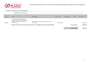 L’agriculture représente un enjeu majeur pour l’économie alsacienne, mais également pour l’aménagement, le dynamisme et la diversité du territoire. Les agriculteurs produisent nos aliments, entretiennent nos paysages, créent de l’emploi et contribuent à la vitalité de nos territoires ruraux. Les enjeux de ces différents partenariats sont donc nombreux et variés. Dans ce rapport, il est proposé de renouveler la signature de la convention de financement complémentaire des aides agricoles de la Collectivité européenne d’Alsace et de la Région Grand-Est jusqu'au 31 décembre 2026 et d'attribuer des subventions de fonctionnement pour un montant total de 39 900 €.