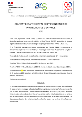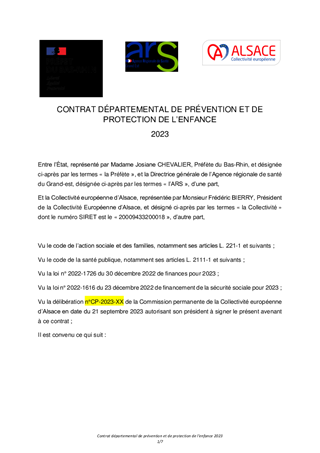 L’Etat propose la signature de nouveaux Contrats départementaux de prévention et de protection de l’enfance pour l’année 2023, dans la lignée des contrats signés par les deux Conseils départementaux 67 et 68 en 2021 et 2020 respectivement. Pour le territoire haut-rhinois, les recettes attribuées pour 2023 représentent 2 112 802€. Ce contrat, déjà présenté lors de la Commission Permanente du 19 juin dernier, doit être approuvé à nouveau en raison d’une erreur technique. Pour le territoire bas-rhinois, les recettes attribuées pour la réalisation des projets contenus dans le contrat 2023 s’établiront à 3 744 691 €. Par ailleurs, afin que la CeA puisse atteindre les objectifs posés par ce contrat sur le périmètre de l’Eurométropole de Strasbourg et eu égard à l’existence de la délégation sociale, il convient de contractualiser avec la ville de Strasbourg pour qu’elle puisse percevoir les recettes qui lui permettront de recruter les professionnels nécessaires à la mise en œuvre de la stratégie de prévention et de protection de l’enfance, soit 350 000 € pour 2023. Enfin, l’engagement dans des contrats départementaux de prévention et de protection de l’enfance suppose de produire chaque année des bilans d’exécution. Ce rapport vous présente ceux qui concernent l’année 2022.