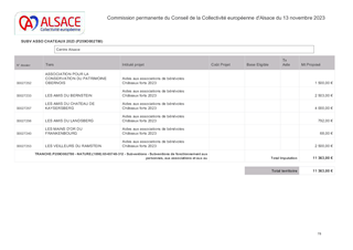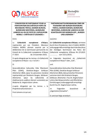 La Collectivité européenne d'Alsace mène une politique de préservation et de valorisation du patrimoine des châteaux forts, porteur de l'identité alsacienne et rhénane et de l'attractivité du territoire. Ce rapport propose à la Commission permanente : - d'attribuer aux associations castrales des subventions pour un montant total de 26 705 €, dans le cadre du dispositif de soutien aux dépenses de fonctionnement adopté le 18 octobre 2021, - d'approuver les conventions avec les partenaires alsaciens, allemands et suisses pour le jeu de piste de l’application mobile « Châteaux et Légendes » / « Burgen und Legenden » dans le cadre du projet transfrontalier INTERREG VI porté par la Collectivité européenne d'Alsace.