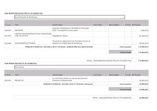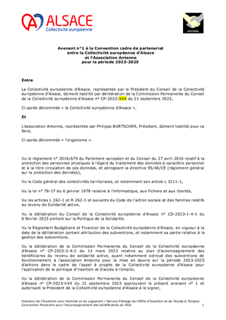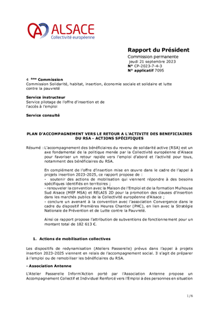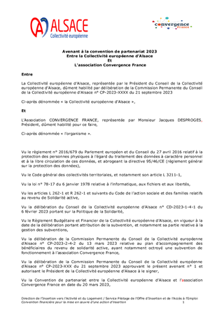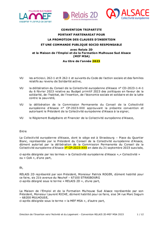 L’accompagnement des bénéficiaires du revenu de solidarité active (RSA) est un axe fondamental de la politique menée par la Collectivité européenne d’Alsace pour favoriser un retour rapide vers l’emploi d’abord et l’activité pour tous, notamment des bénéficiaires du RSA. En complément de l’offre d’insertion mise en œuvre dans le cadre de l’appel à projets insertion 2023-2025, ce rapport propose de : - soutenir des actions de mobilisation qui viennent répondre à des besoins spécifiques identifiés en territoires ; - renouveler la convention avec la Maison de l’Emploi et de la formation Mulhouse Sud Alsace (MEF MSA) et RELAIS 2D pour la promotion des clauses d’insertion dans les marchés publics de la Collectivité européenne d’Alsace ; - conclure un avenant à la convention avec l’association Convergence dans le cadre du dispositif Premières Heures Chantier (PHC), en lien avec la Stratégie Nationale de Prévention et de Lutte contre la Pauvreté. Ainsi ce rapport propose l’attribution de subventions de fonctionnement pour un montant total de 182 613 €.