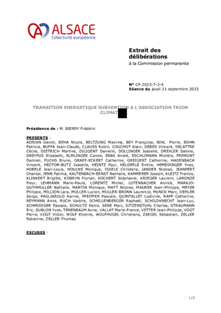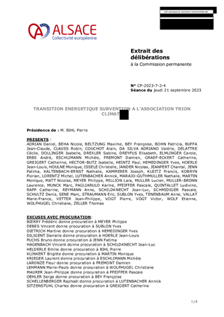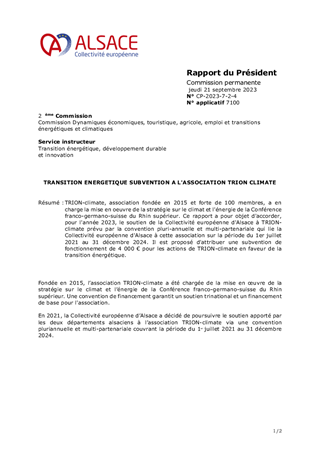 TRION-climate, association fondée en 2015 et forte de 100 membres, a en charge la mise en oeuvre de la stratégie sur le climat et l'énergie de la Conférence franco-germano-suisse du Rhin supérieur. Ce rapport a pour objet d'accorder, pour l'année 2023, le soutien de la Collectivité européenne d'Alsace à TRION-climate prévu par la convention pluri-annuelle et multi-partenariale qui lie la Collectivité européenne d'Alsace à cette association sur la période du 1er juillet 2021 au 31 décembre 2024. Il est proposé d'attribuer une subvention de fonctionnement de 4 000 € pour les actions de TRION-climate en faveur de la transition énergétique.